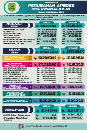 Infografis Perubahan APBDesa Tahun 2025 Desa Kendalrejo memuat informasi rinci mengenai perubahan sumber pendapatan, alokasi belanja, serta prioritas pembangunan dan pemberdayaan masyarakat hingga akhir tahun anggaran yang disusun berdasarkan Peraturan Kepala Desa Kendalrejo Nomor 12 Tahun 2025.