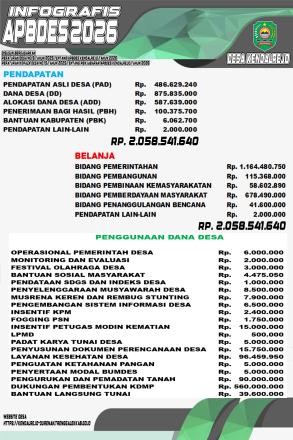 Dalam rangka pelaksanaan Undang-Undang Republik Indonesai Nomor 6 Tahun 2014 tentang Desa, pasal 24 (d) yang mengatur tentang keterbukaan publik serta pelaksanaan prinsip tata Pemerintahan Desa yang akuntabel, transparan, profesional, efektif dan efisien, bersih serta bebas dari kolusi, korupsi dan nepotisme, maka bersama ini kami sampaikan Infografis Desa Kendalrejo untuk Tahun Anggaran 2025 yang disusun berdasarkan Peraturan Desa no. 09 Tahun 2025 Tentang APBDes Tahun Anggaran 2026 dan Peraturan Kepala Desa No. 15 Tahun 2025 tentang Penjabaran Anggaran Pendapatan dan Belanja Desa Tahun Anggaran 2026.